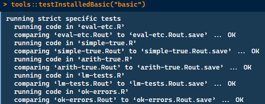 tools::testInstalledBasic(): for testing base R functionalitiestools::testInstalledPackage(): for testing a specific packagetools::testInstalledPackages(): for testing base and recommended packagesExample: tools::testInstalledBasic("basic") to test base R functionalities