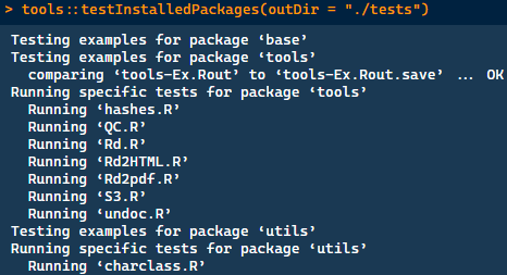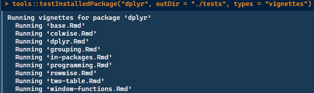 tools::testInstalledPackage("dplyr", outDir = "./tests", types = "examples")tools::testInstalledPackage("dplyr", outDir = "./tests", types = "tests")tools::testInstalledPackage("dplyr", outDir = "./tests", types = "vignettes")Notes on testing packages: